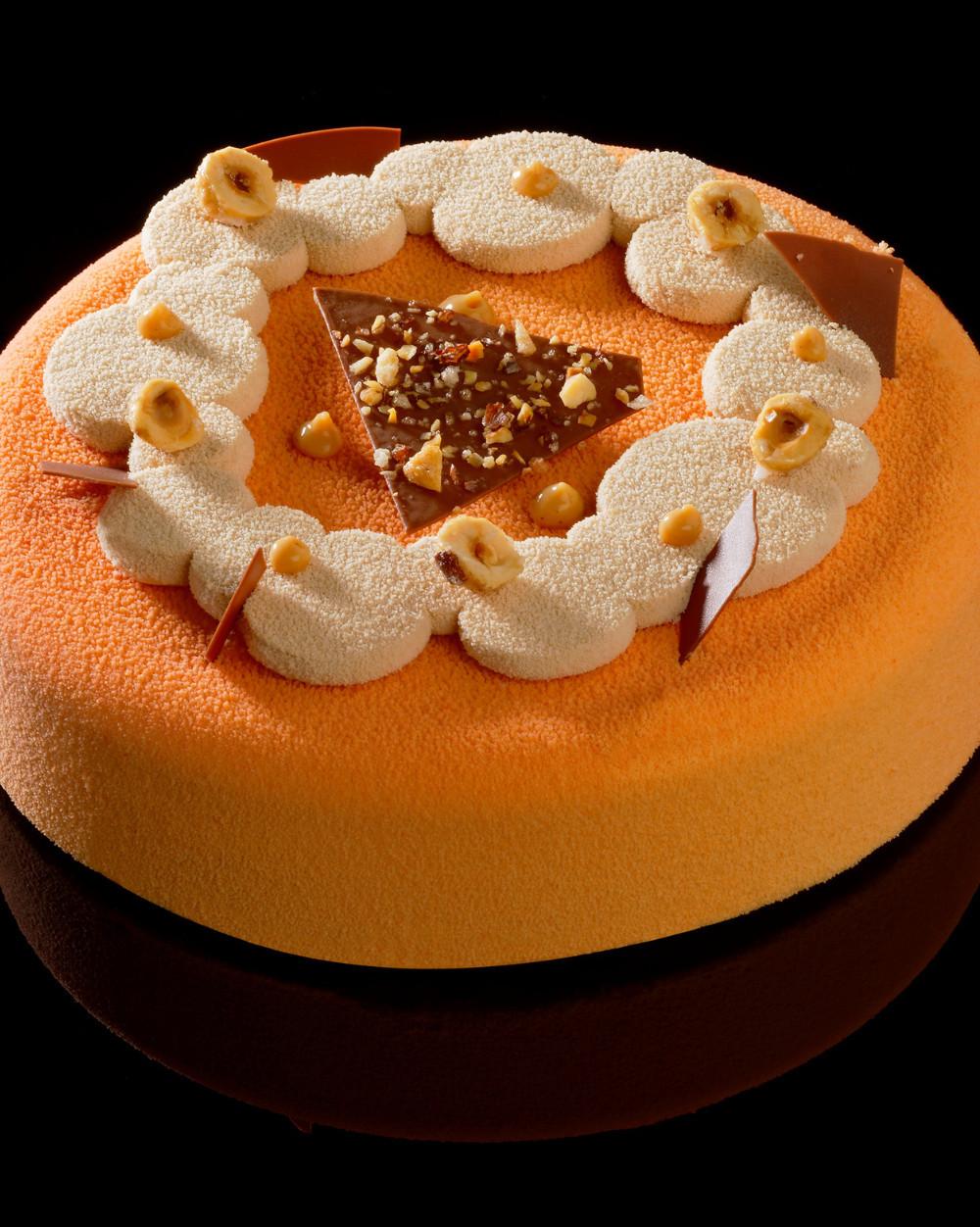Croustillant noisette, biscuit moelleux noisette, compotée d'abricot et mousse abricot.