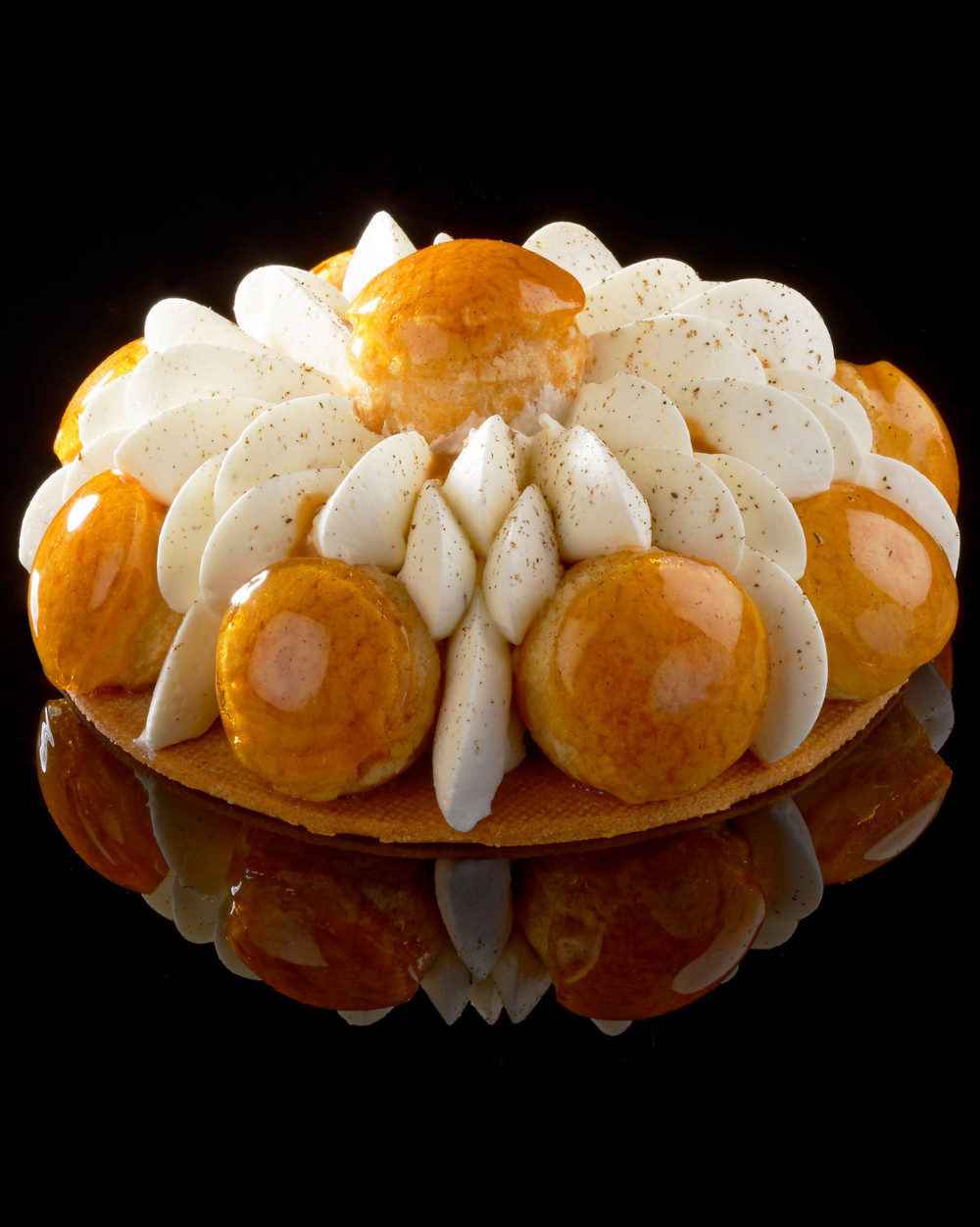 Pâte sablée, pâte à choux, crémeux vanille et d'une chantilly vanille.