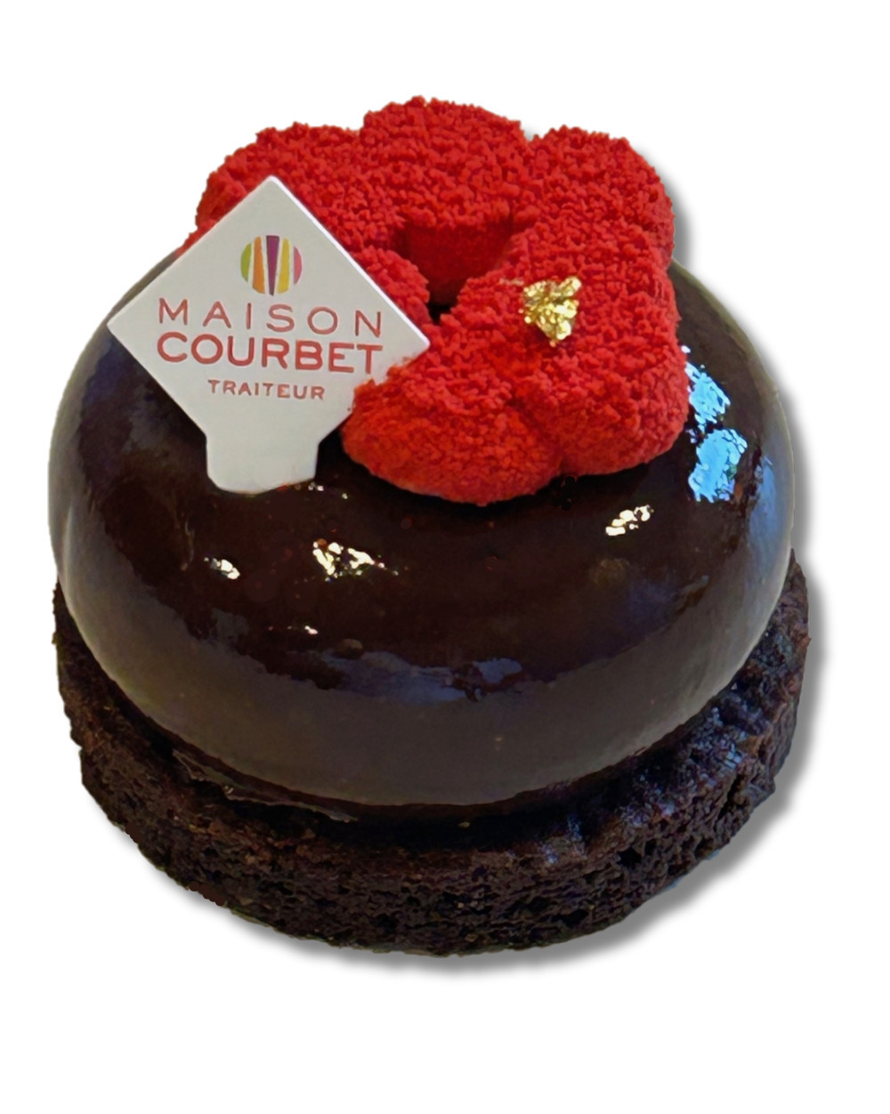 Le Rouge et Noir se compose d'un croustillant riz soufflé, biscuit chocolat, confit framboise, crème brulée vanille, mousse chocolat.