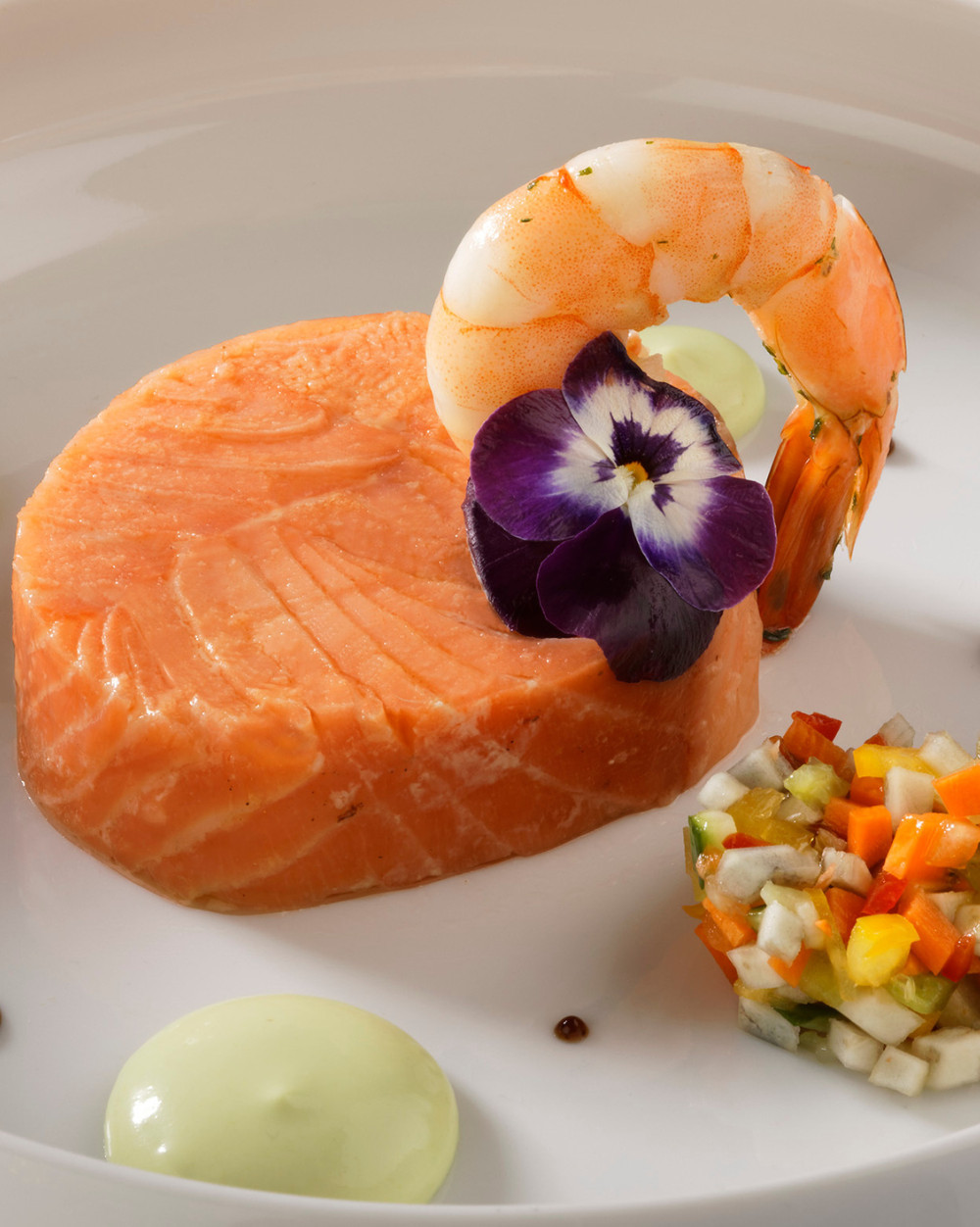 Cœur de saumon juste confit, légèrement fumé, crème de wasabi et brunoise de légumes marinés